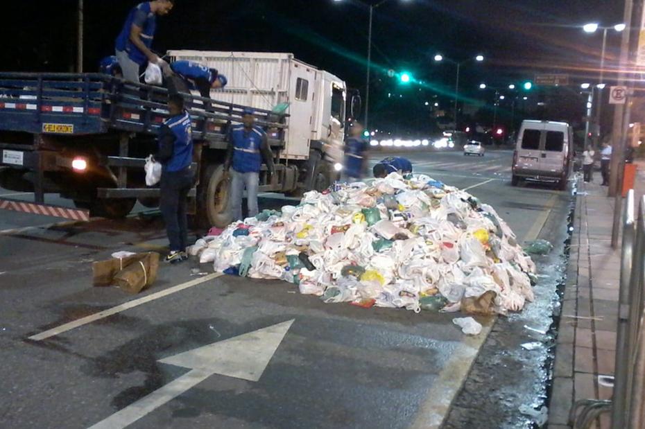 Imagem mostra os alimentos jogados sobre uma das faixas da avenida dos Andradas