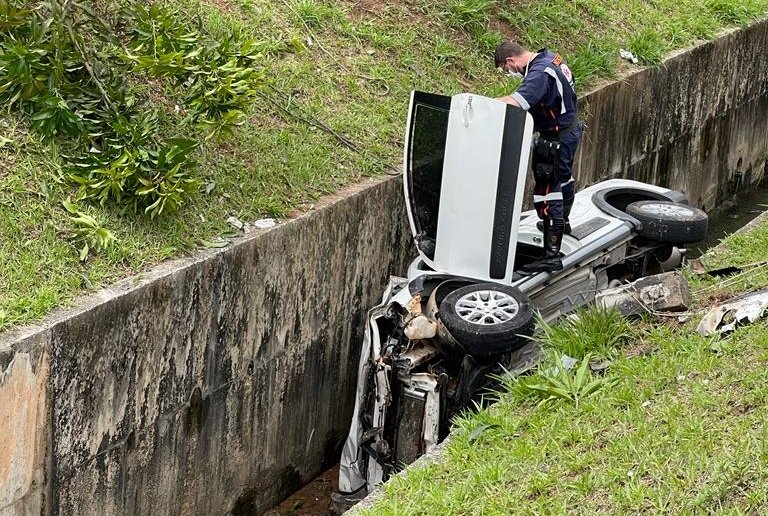 Carro ultrapassa mureta, cai em córrego e motorista morre, em Contagem