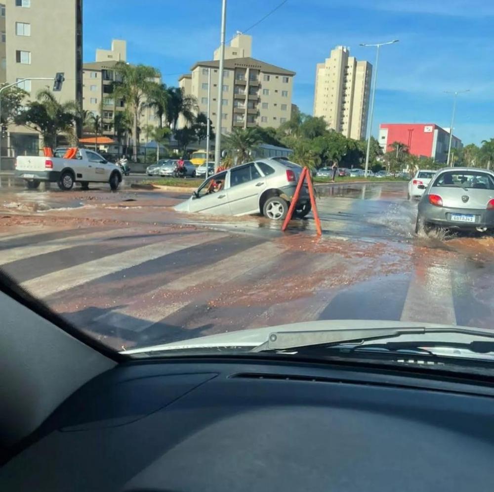 Motorista cai com o carro em buraco em Uberlândia