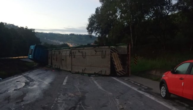 Trecho da Fernão Dias é fechado após cegonheira tombar e espalhar carros pela pista