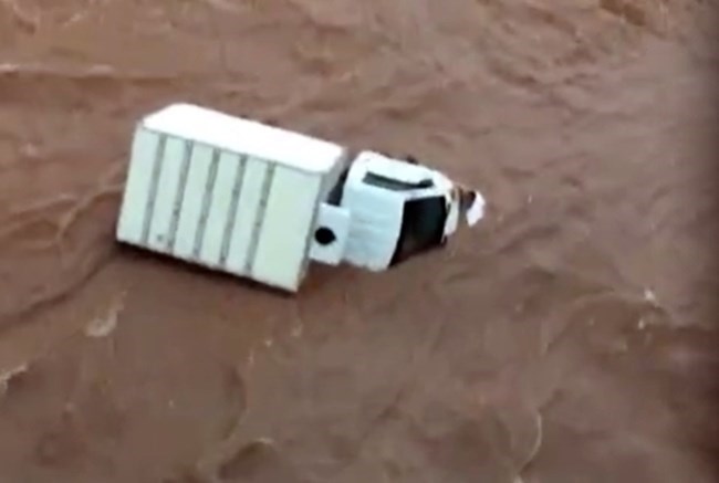 Caminhão parecia de brinquedo em meio à força da água do Arrudas que invadiu a Tereza Cristina