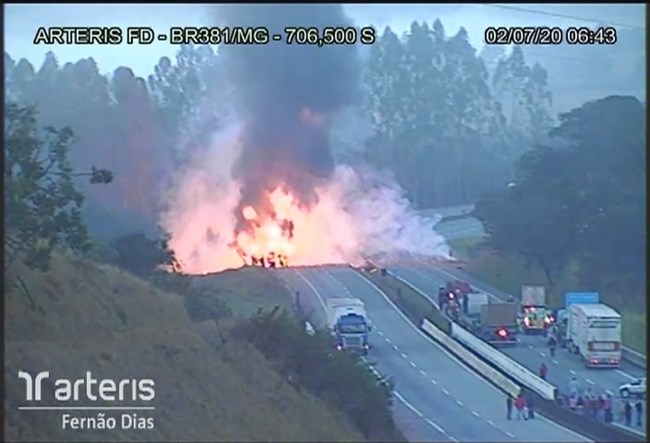 Carreta tomba, pega fogo e fecha a rodovia Fernão Dias em Nepomuceno, no Sul de Minas