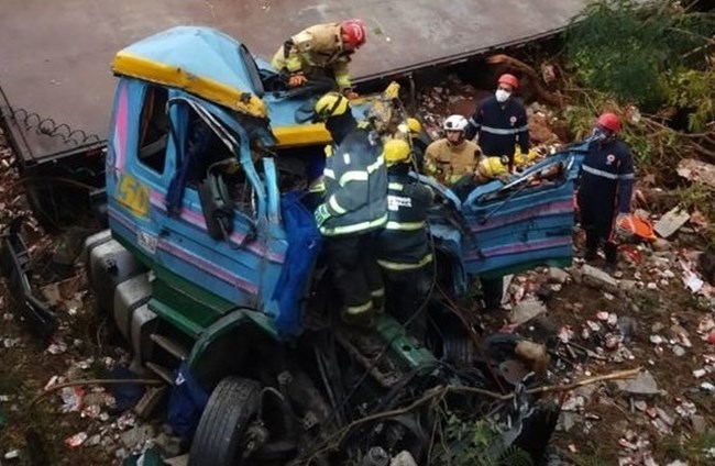 Carreta carregada com cerveja e carro passeio caem em ribanceira próximo à curva do Ponteio