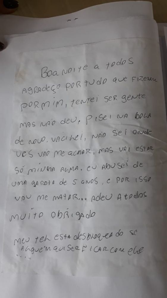 Em 24 de agosto, após cometer o crime, o homem deixou uma carta de despedida na casa da mãe dele, em Sarzedo, na Grande BH. No bilhete, ele admitiu o crime e adotava tom suicida.