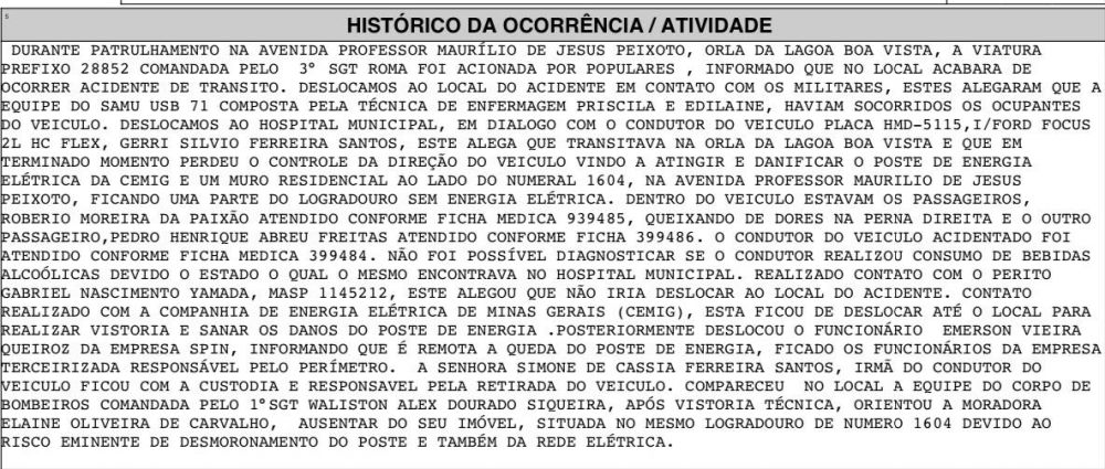 De acordo com a Policia Militar, durante patrulhamento de uma viatura, comandada pela 3º Sargento Roma, foram acionados por populares informando que um carro teria colidido com um poste e que a região ficará sem energia.
